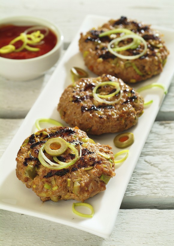 Modelezi carnea în chiftele groase de 2 cm şi le pui pe grătarul încins. Le întorci pe fiecare parte la interval de 2-3 minute, până se rumenesc. Le servești, dacă vrei, cu rondele de praz și cu feliuțe de măsline.