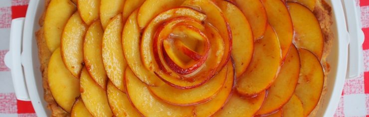 Taie piersicile felii cat mai subtiri (cu sau fara coaja, dupa gust) si asaza-le in tava, deasupra cremei intarite, pornind din exterior catre centrul tavii.