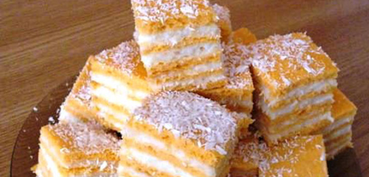 Ingrediente: 5 oua, 8 linguri zahar, 8 linguri ulei, 2 lingurite amoniu pentru prajituri, coaja rasa de la 1 lamaie, faina cat cuprinde. Se coc tot 5 foi. Ies albe si frumoase. Se poate unge si ultima foaie cu un strat fin de crema si apoi s epresara cu nuca de cocos din belsug.