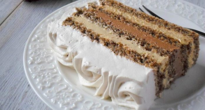 6. Pentru a forma prăjitura, însiropăm prima foaie de blat și o tapetăm cu jumătate din crema de cappuccino, pe deasurpra adăugăm 2-a foaie de blat, însiropată, și o tapetăm cu un strat de cremă de cafea. Procedăm la fel, alternând cremele. La final, decorăm prăjitura cu frișcă.
